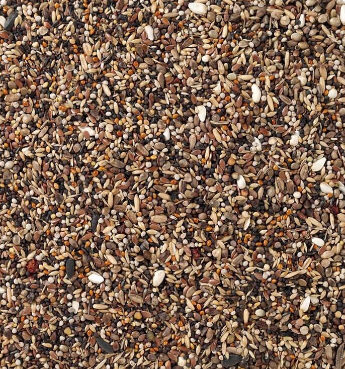 Samenstelling: Wilde zaden, raapzaad, witzaad, perilla wit, nigerzaad, lijnzaad, boekweit, haver gepeld, kempzaad, mariëndistel, perilla bruin, zonnepitten zwart, sesamzaad, cardy, cichoreizaad, spinaziezaad, lijsterbessen, dennenzaad fijn, cypressenzaad