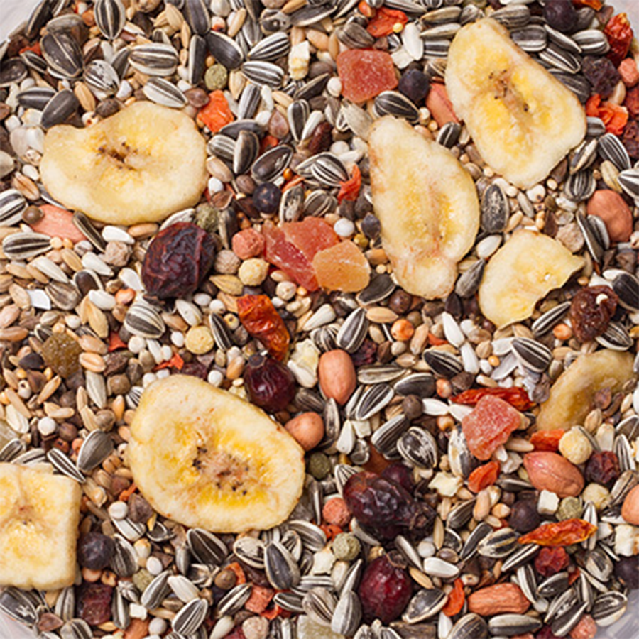 Zonnepitten gestreept, boekweit, sorgho wit, cardy, haver gepeld, millet geel, tarwe, paddyrijst, gerst, geëxtrudeerde pellets, vitsen, grit, jeneverbessen, gepelde pinda’s, wortelstukjes, bananenschijfjes, rozenbottelvrucht, ananas, papaya, rozijnen, sorgho rood, lijsterbessen, witzaad, mariëndistel, lijnzaad, appelstukjes, Japanse millet, chilipepers